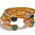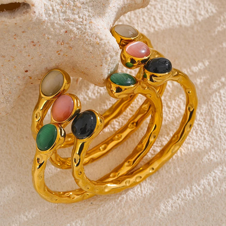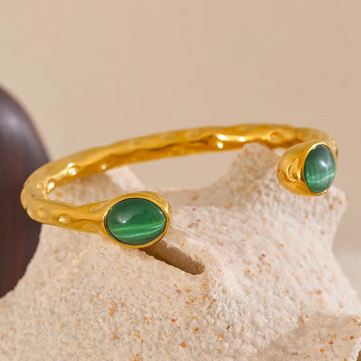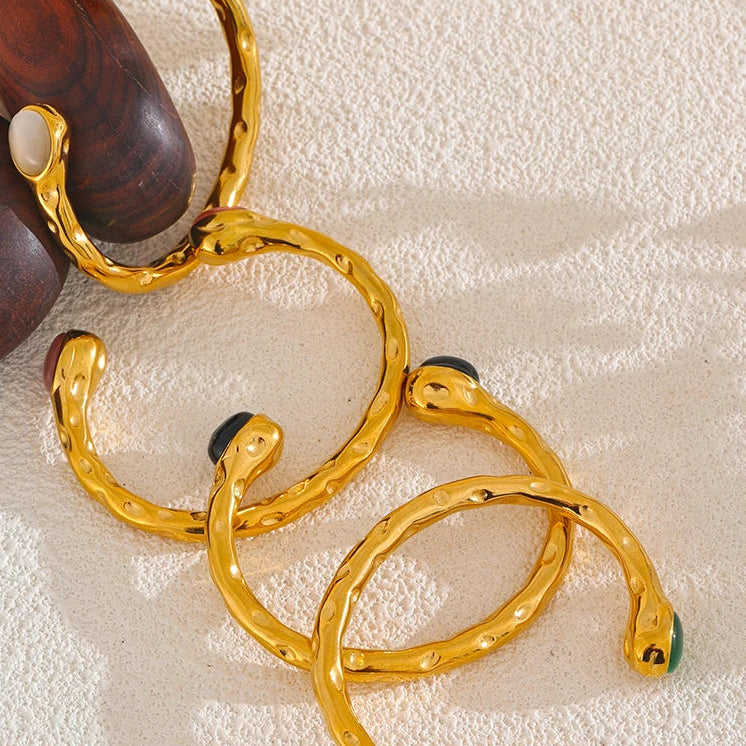 Sculptural and expressive, the Céliane Cuff blends organic texture with luminous natural stone accents. The softly hammered golden band wraps the wrist with fluid irregularity, while polished oval stones introduce depth and quiet color.